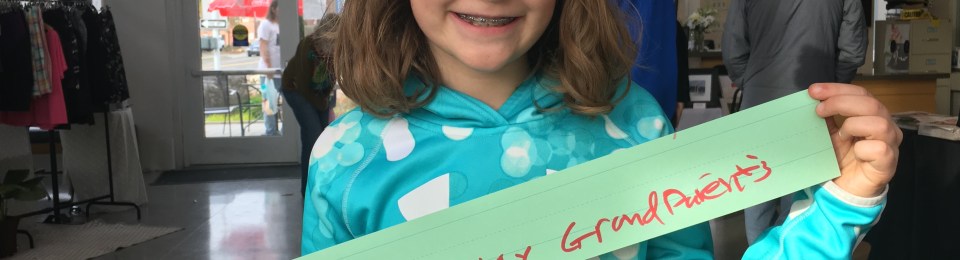 Last Saturday, I got to spend part of the afternoon at the Durham Art Walk, inviting passersby to share the things for which they’re grateful. Little did I know what a moving and delightful afternoon it would turn out to be, as several dozen people, aged 2 to 70-something, stopped by to add their sentence strip gratitudes to our list poem, which you’ll find below. (I played a little with the order, to make sure everyone’s lines would shine.) Thanks to everyone who participated and wishing you all a wonderful season of gratitude.